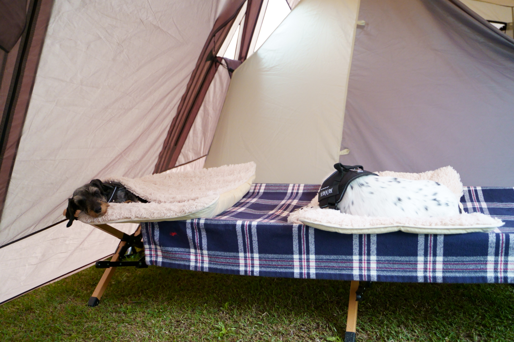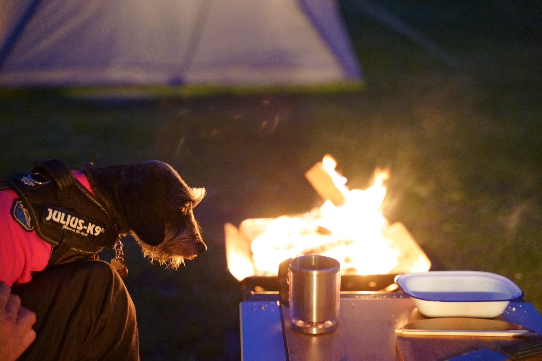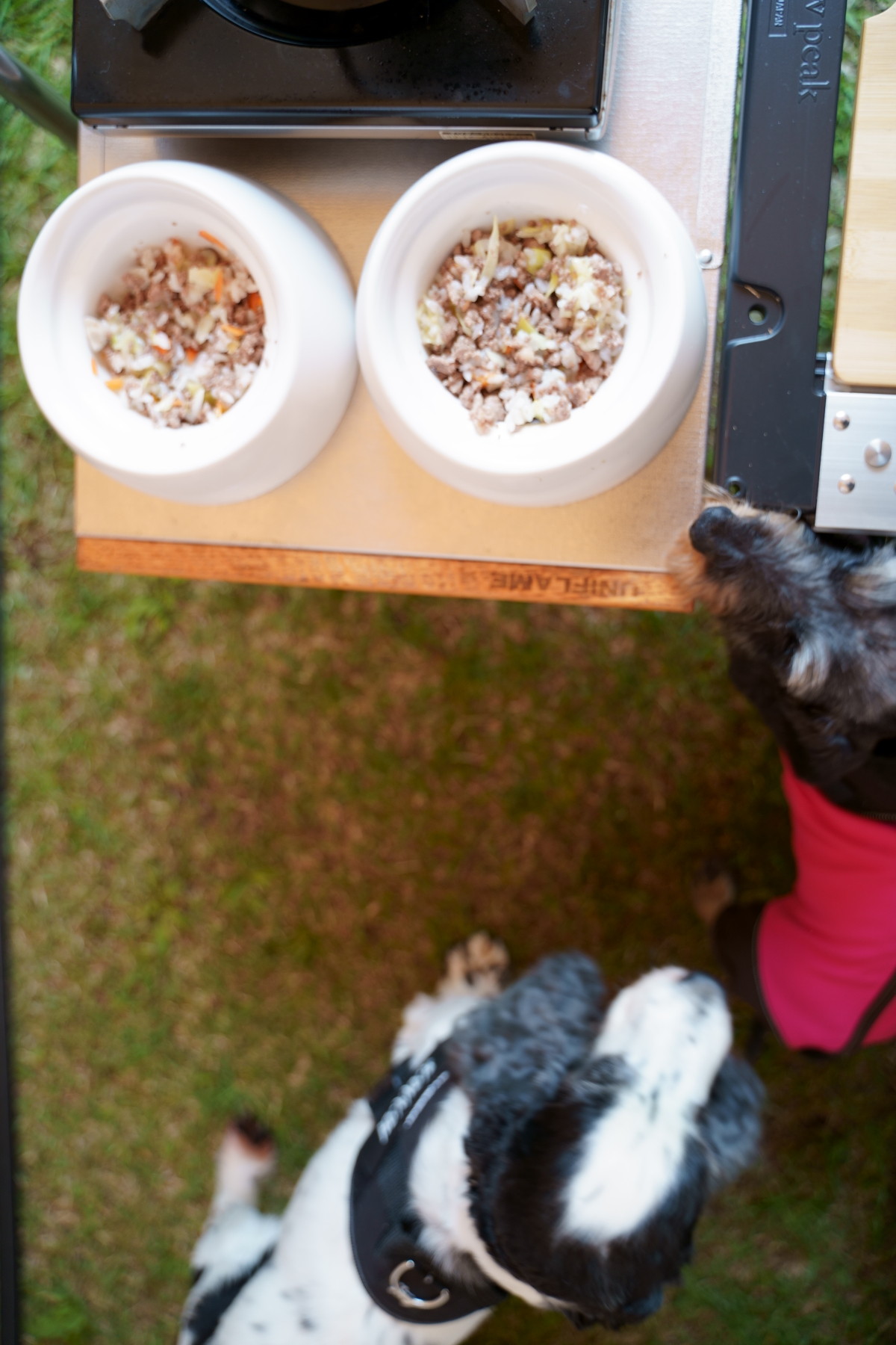 家ではお腹が空くとふたりで吠え始めるけど、キャンプでは大人しいのね。