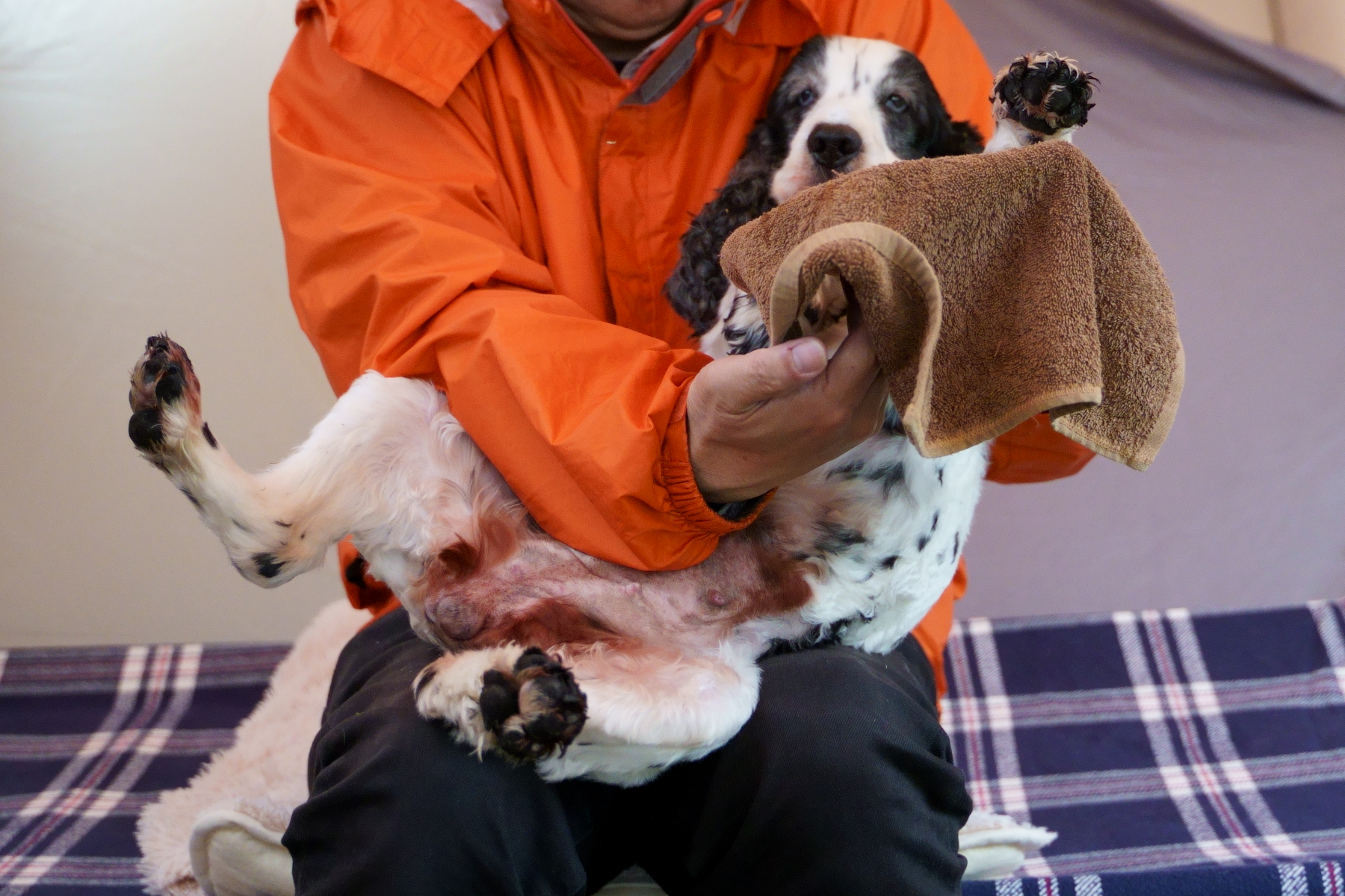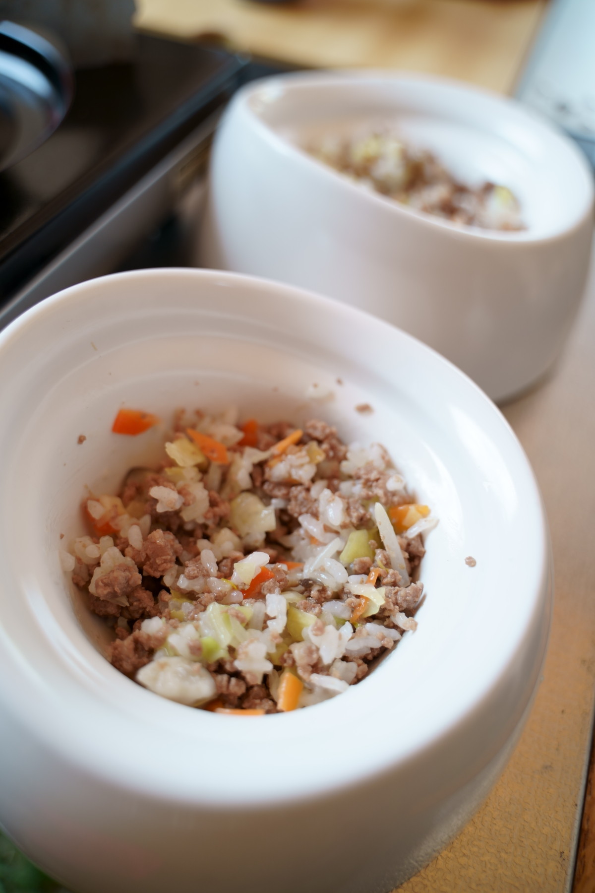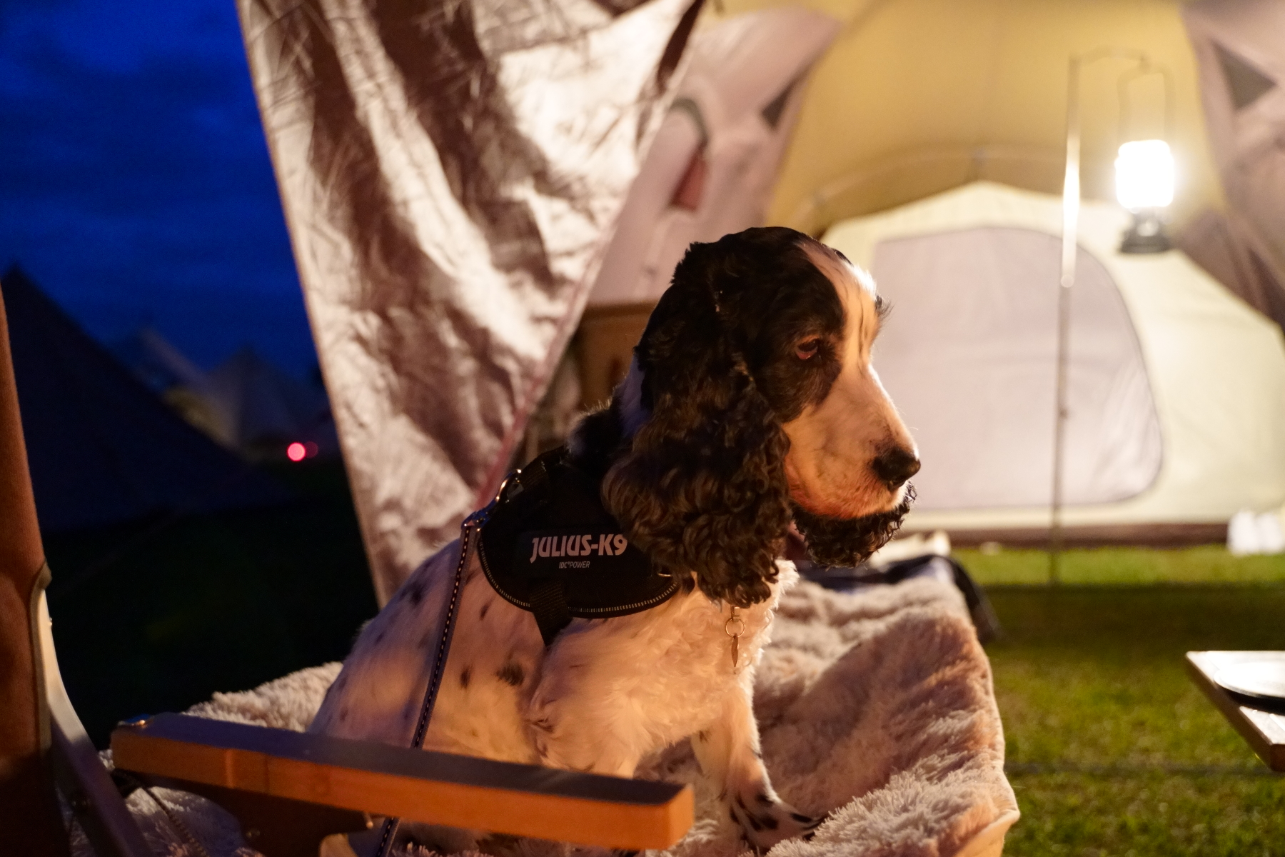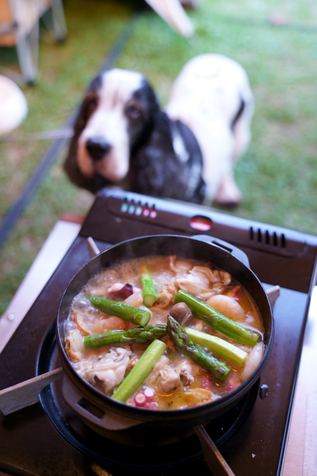 家ではお腹が空くとふたりで吠え始めるけど、キャンプでは大人しいのね。