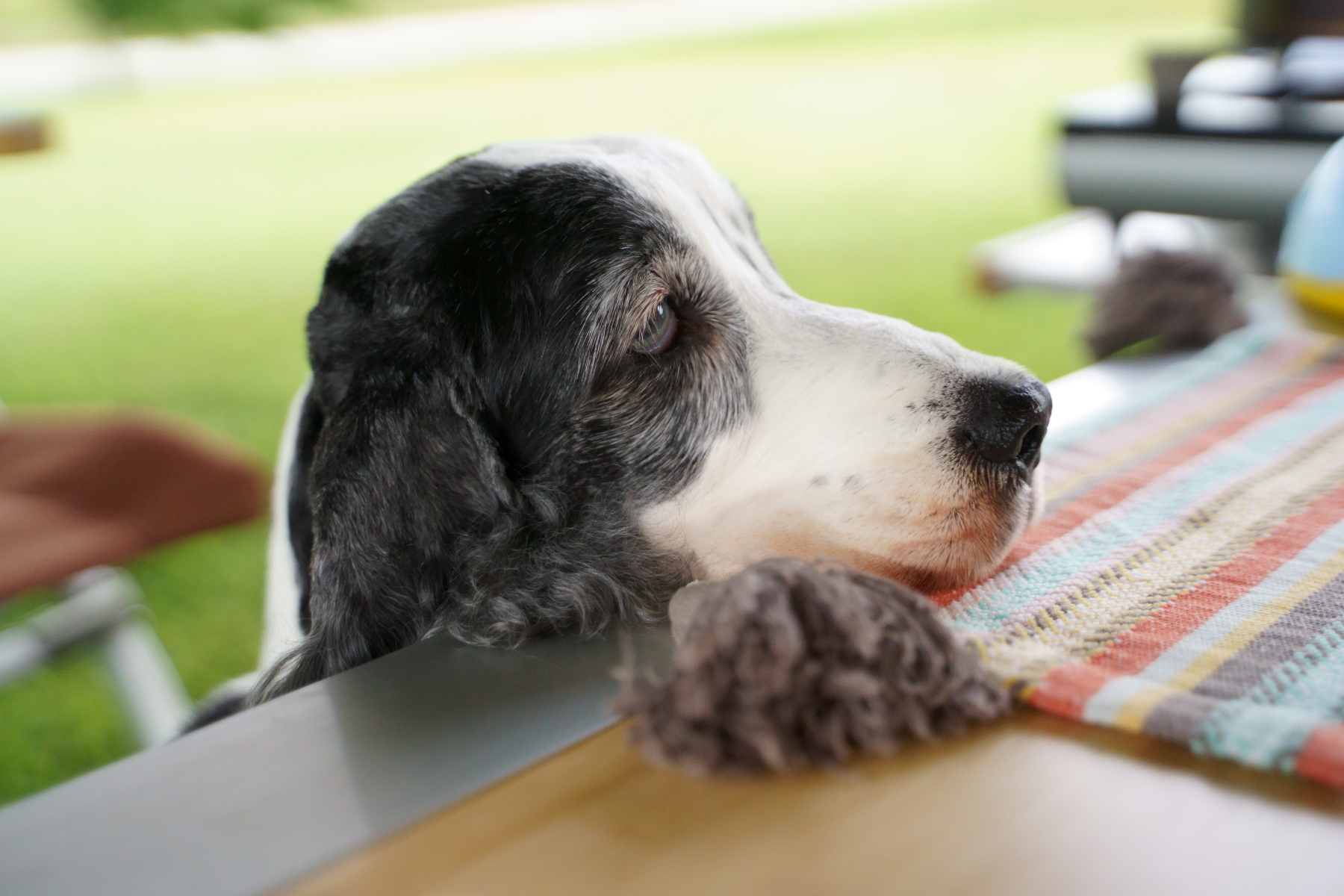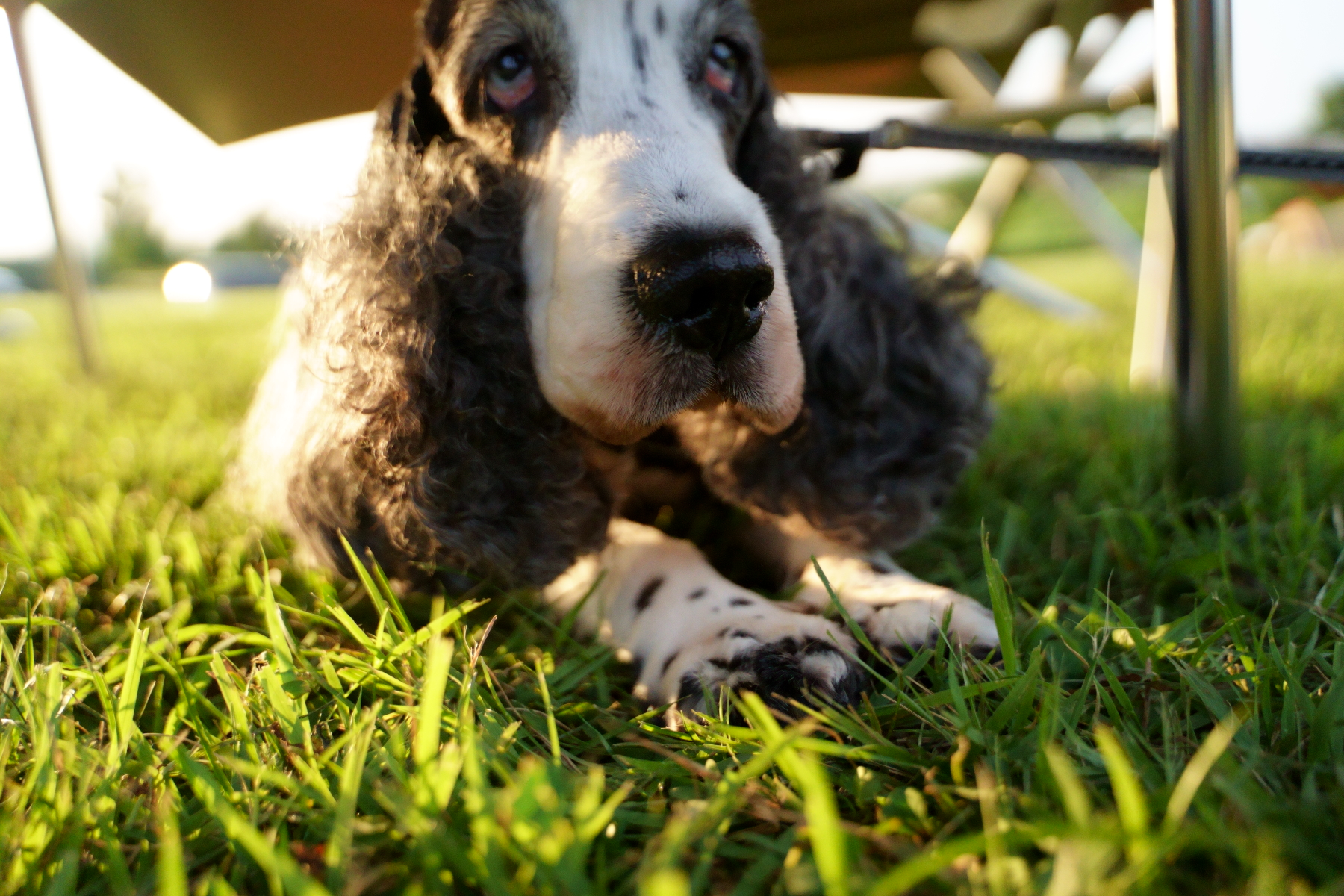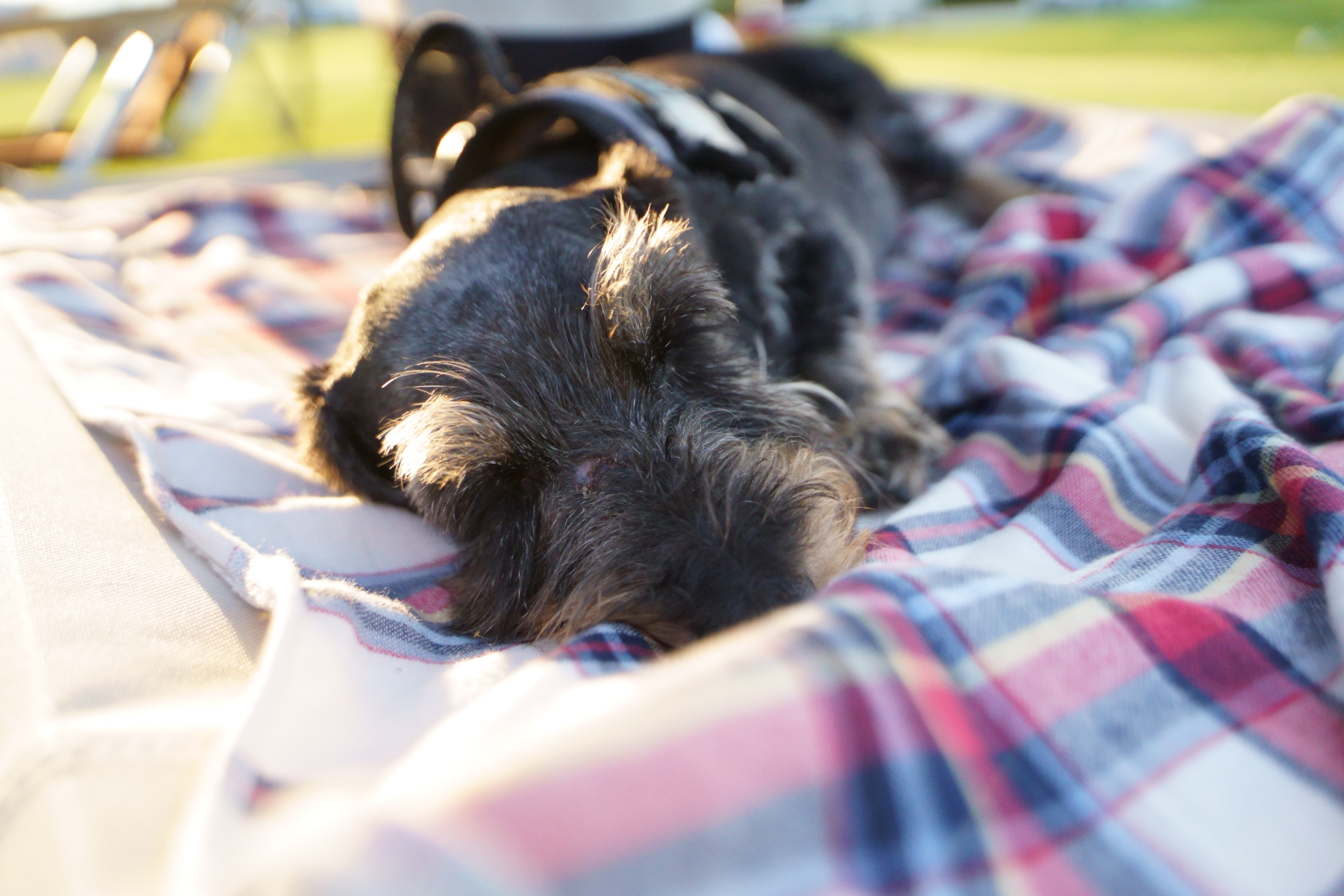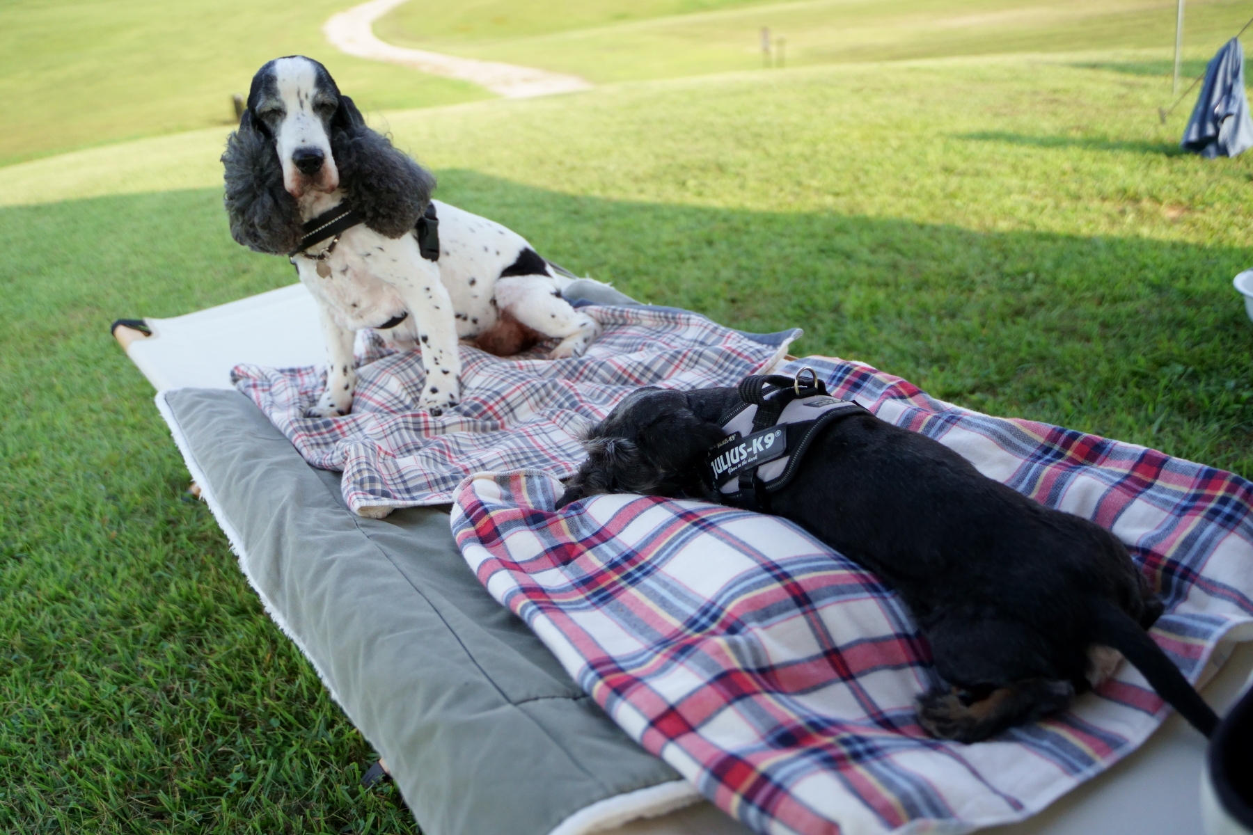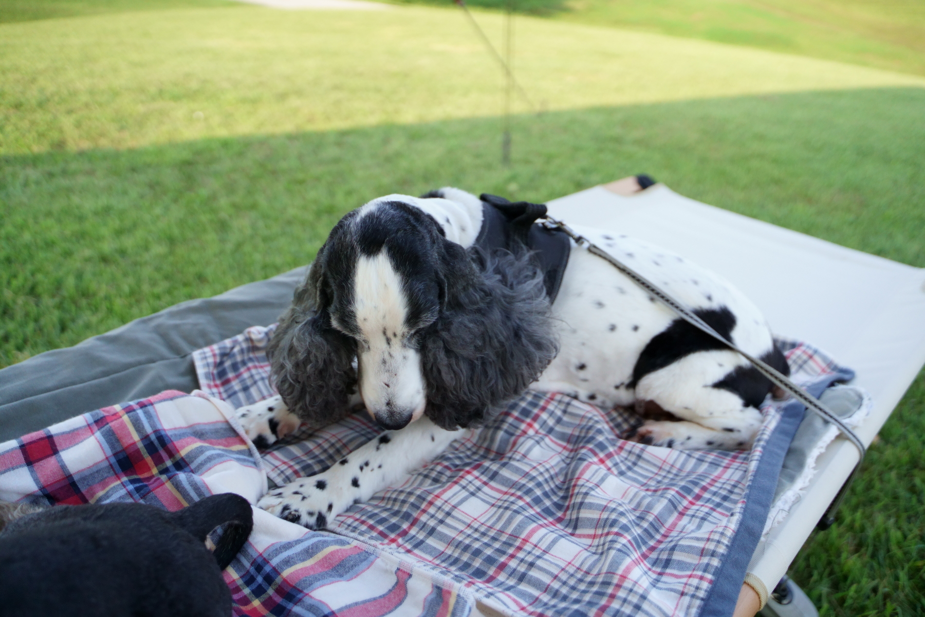 新しいタープもシールド仕様なので下にいると多少は違うけど、周りの空気が暑いから暑さからは逃れられません。ワンコ達は芝の上で寝るのが一番涼しいかな。