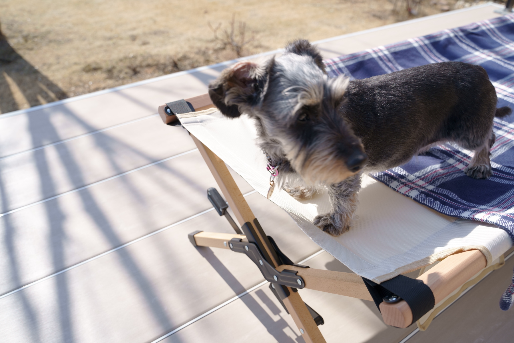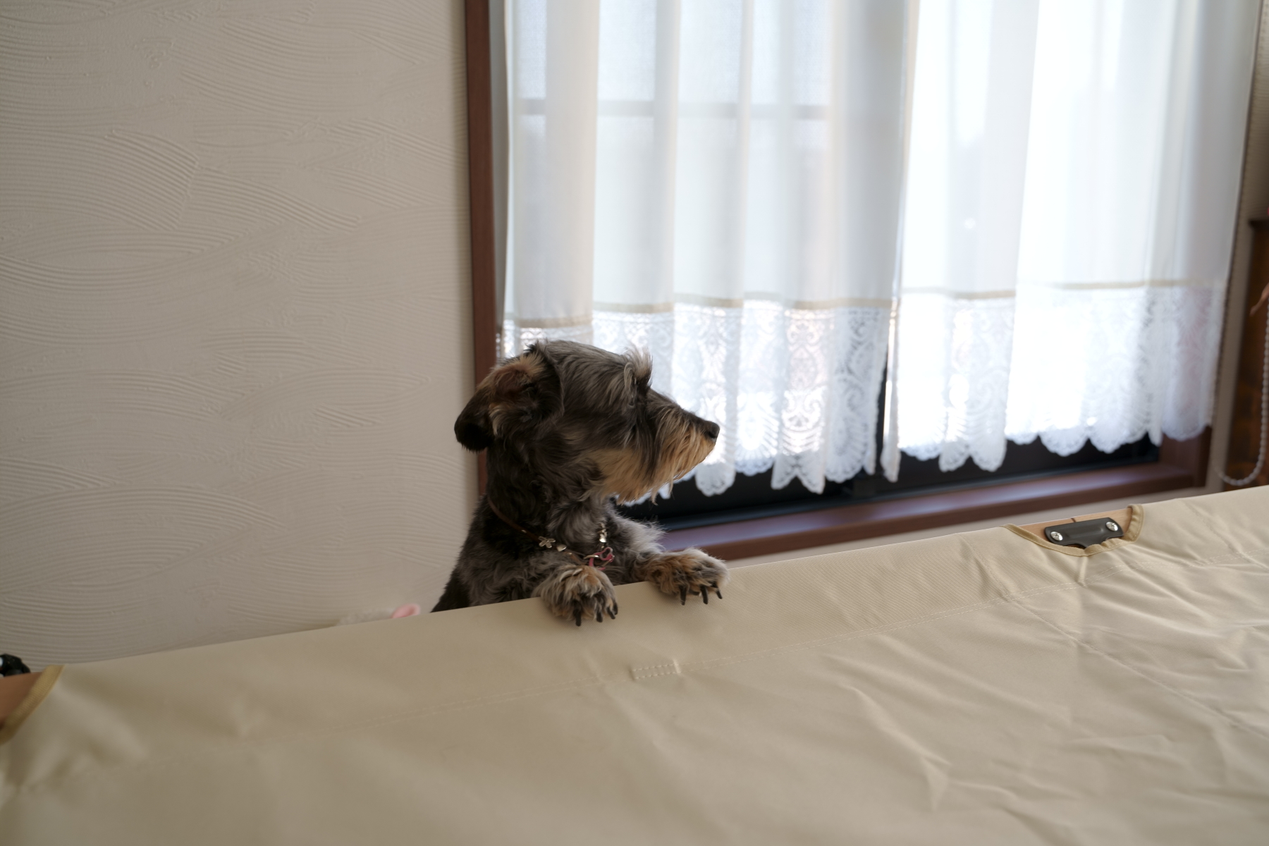 デイジーは自分では乗れないね。コットの上が気になっているみたいです。